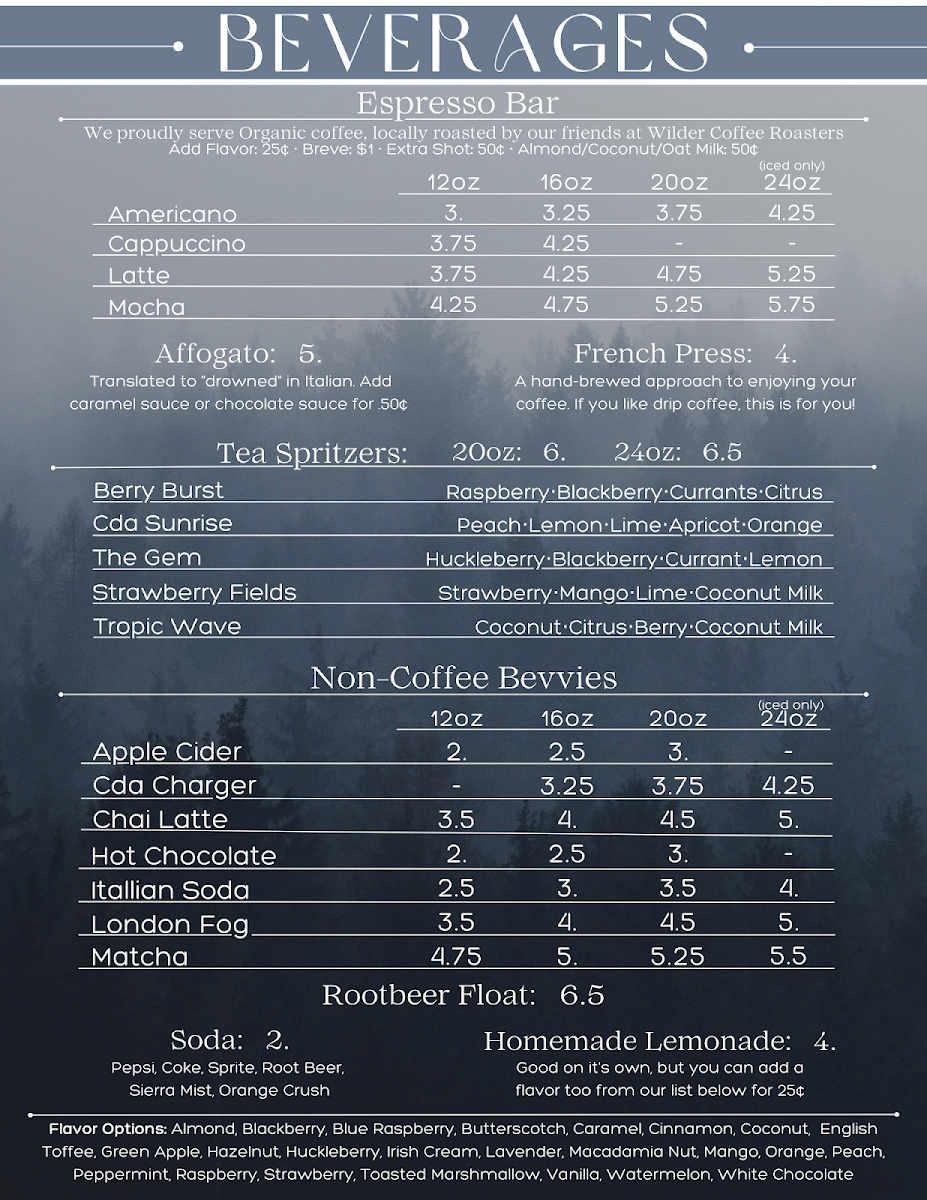 Inland Café & Tea's menu features a tantalizing selection of beverages, with standout options including the Berry Burst Tea Spritzer that combines refreshing raspberry, blackberry, and currants, or the invigorating Tropic Wave with its heavenly mix of coconut and citrus. Each drink is crafted with care and attention to detail, providing a burst of flavor for your palate at just $6.00.